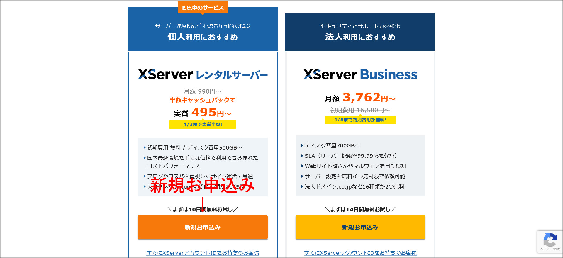 エックスサーバーの申し込み画面が開きます。